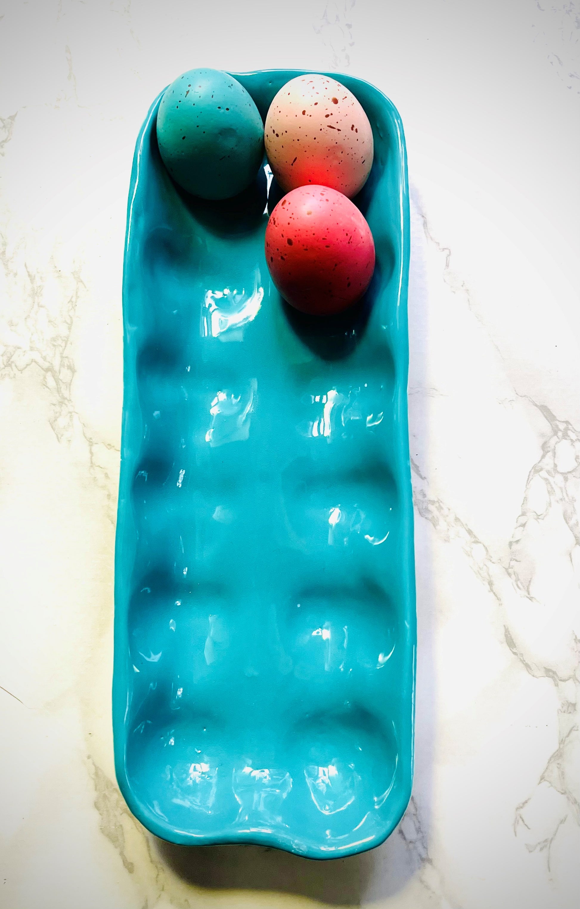 These egg-holders can hold up to 12 small eggs. It is made with white low fire clay and non-toxic glaze.