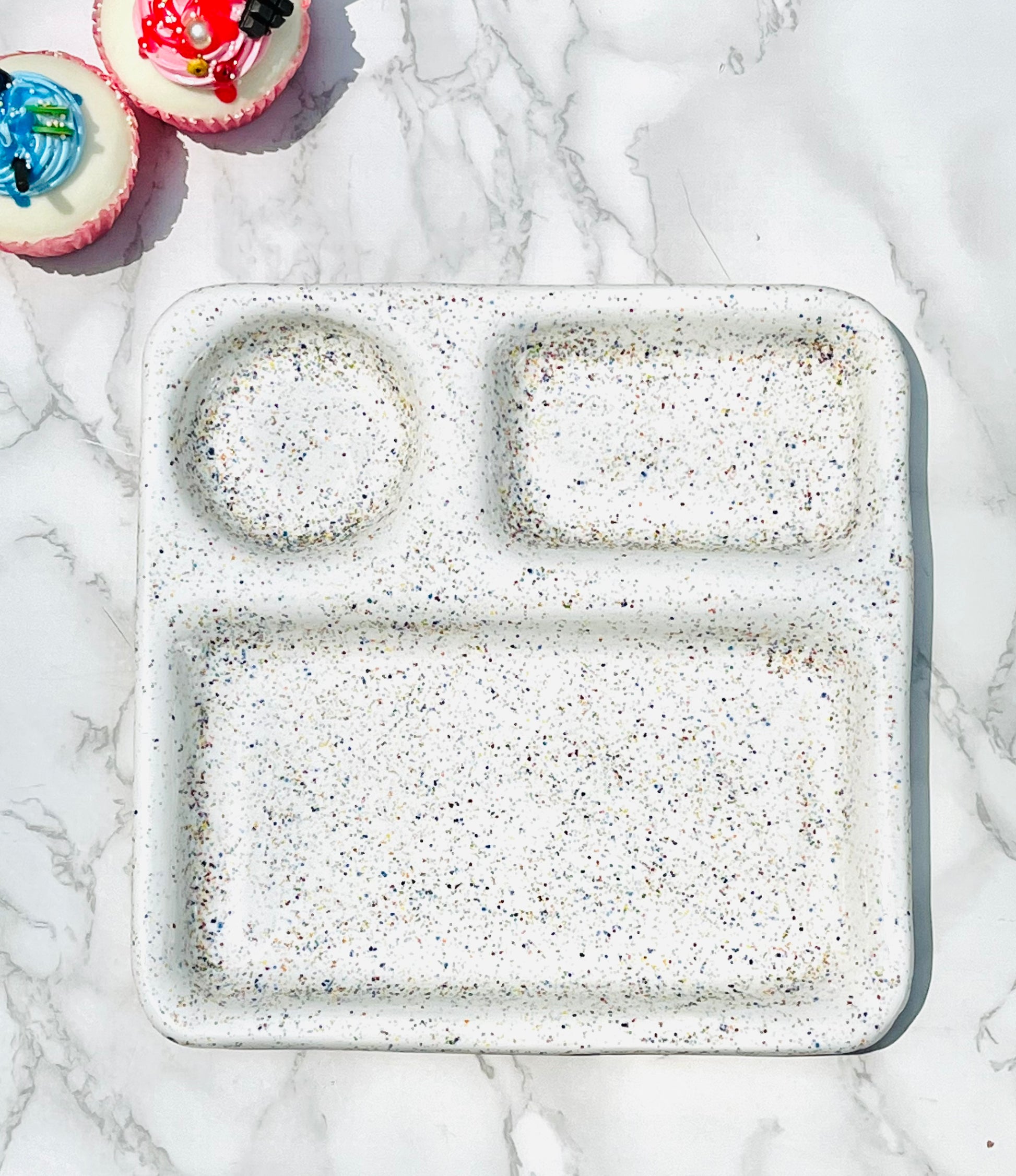 The lunch tray is hand-made with clay and hand-painted with non-toxic glaze. This tray has three compartments for food or snack.