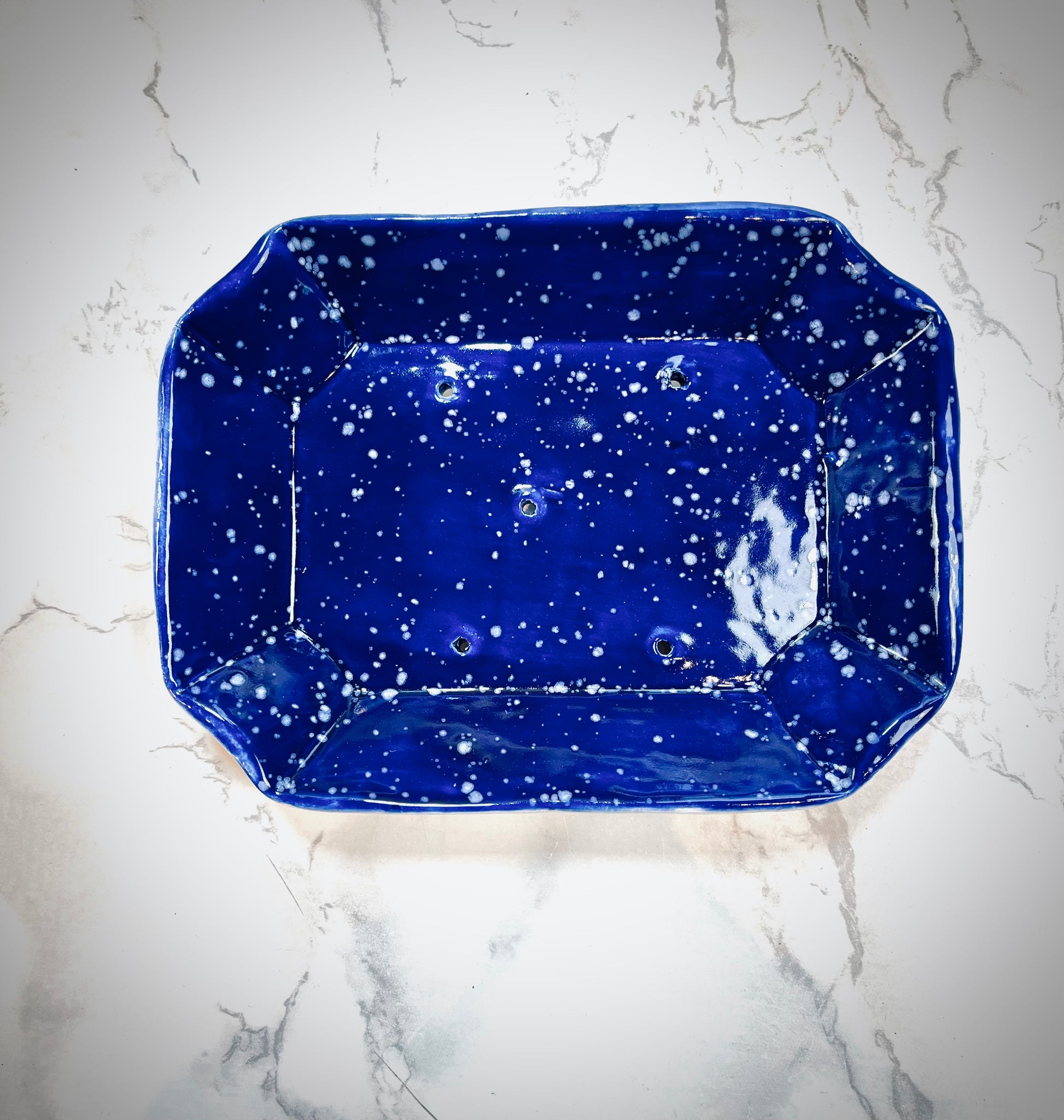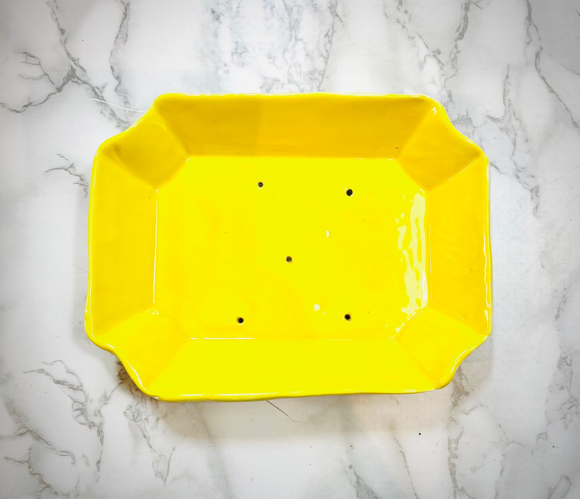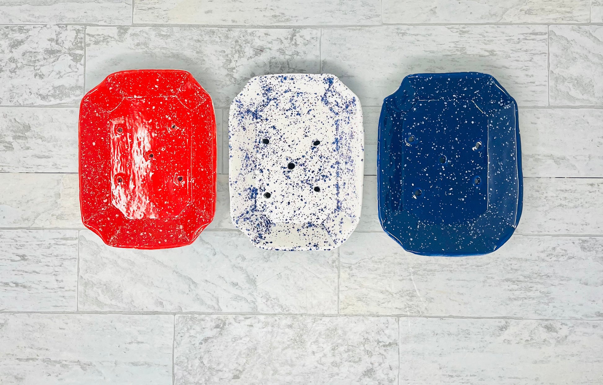These small sponge/soap holders are hand-made with low fire clay and hand-painted with non-toxic glazes. This soap holder is perfect for small bathroom and kitchen sinks.