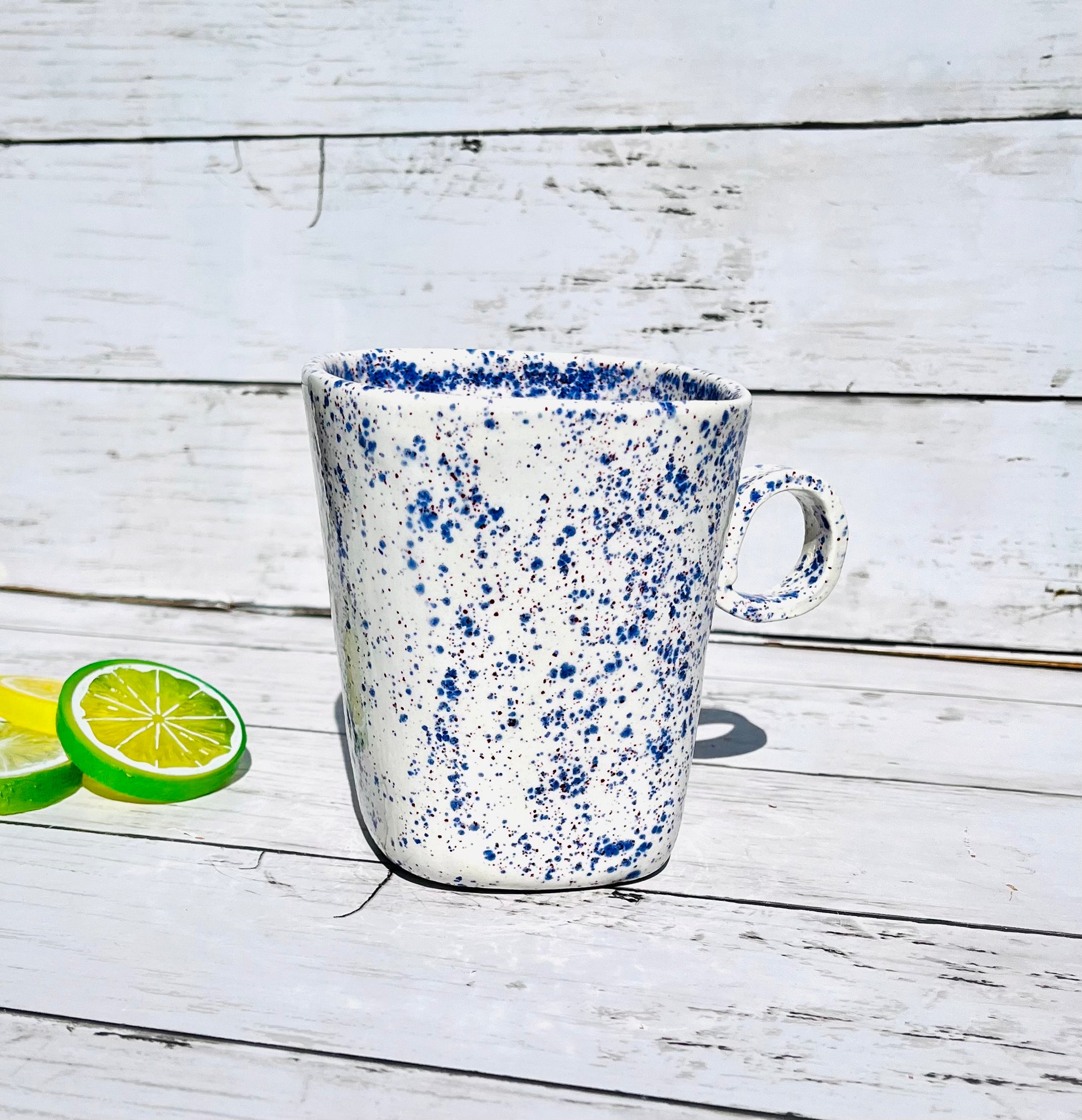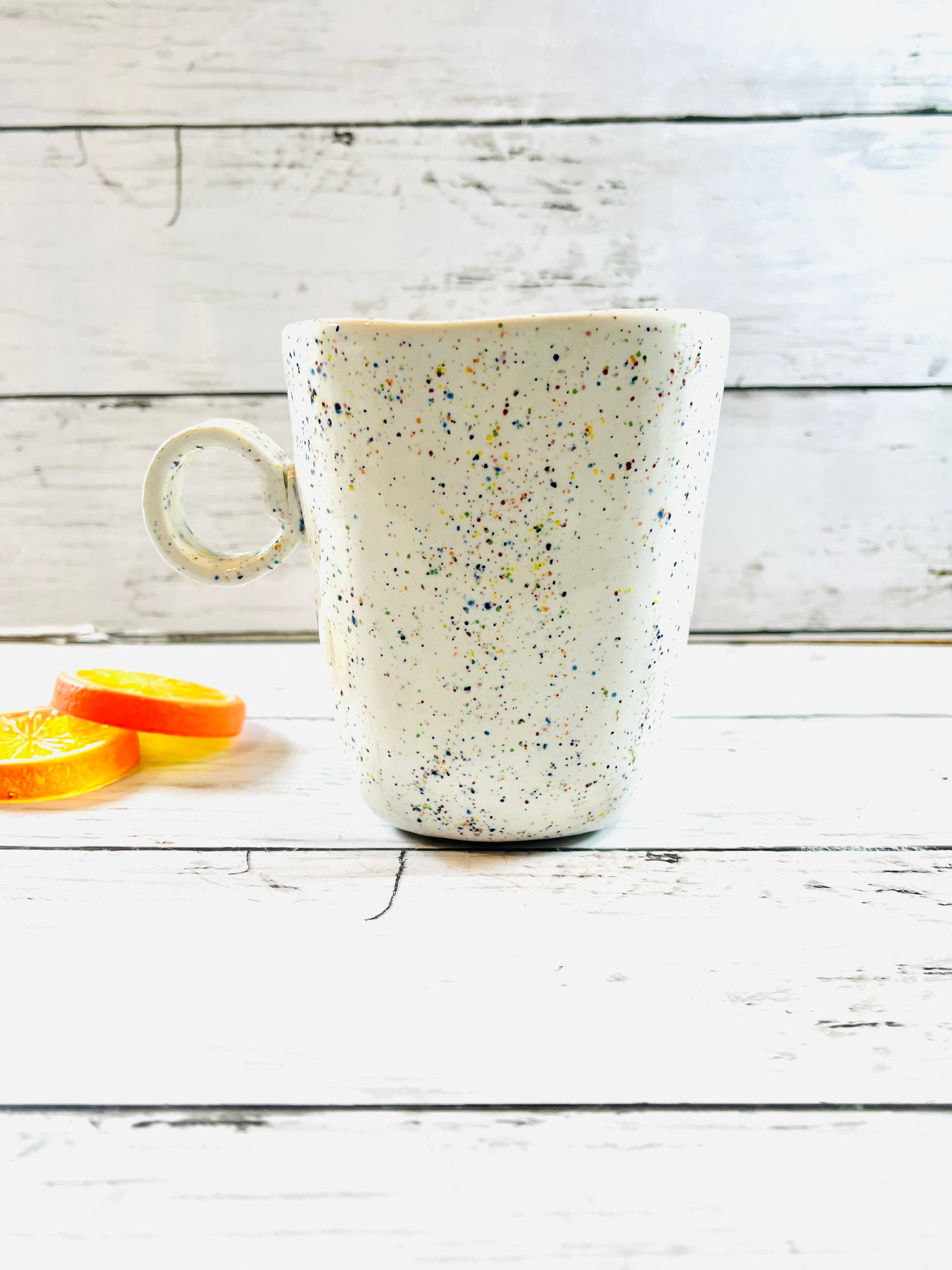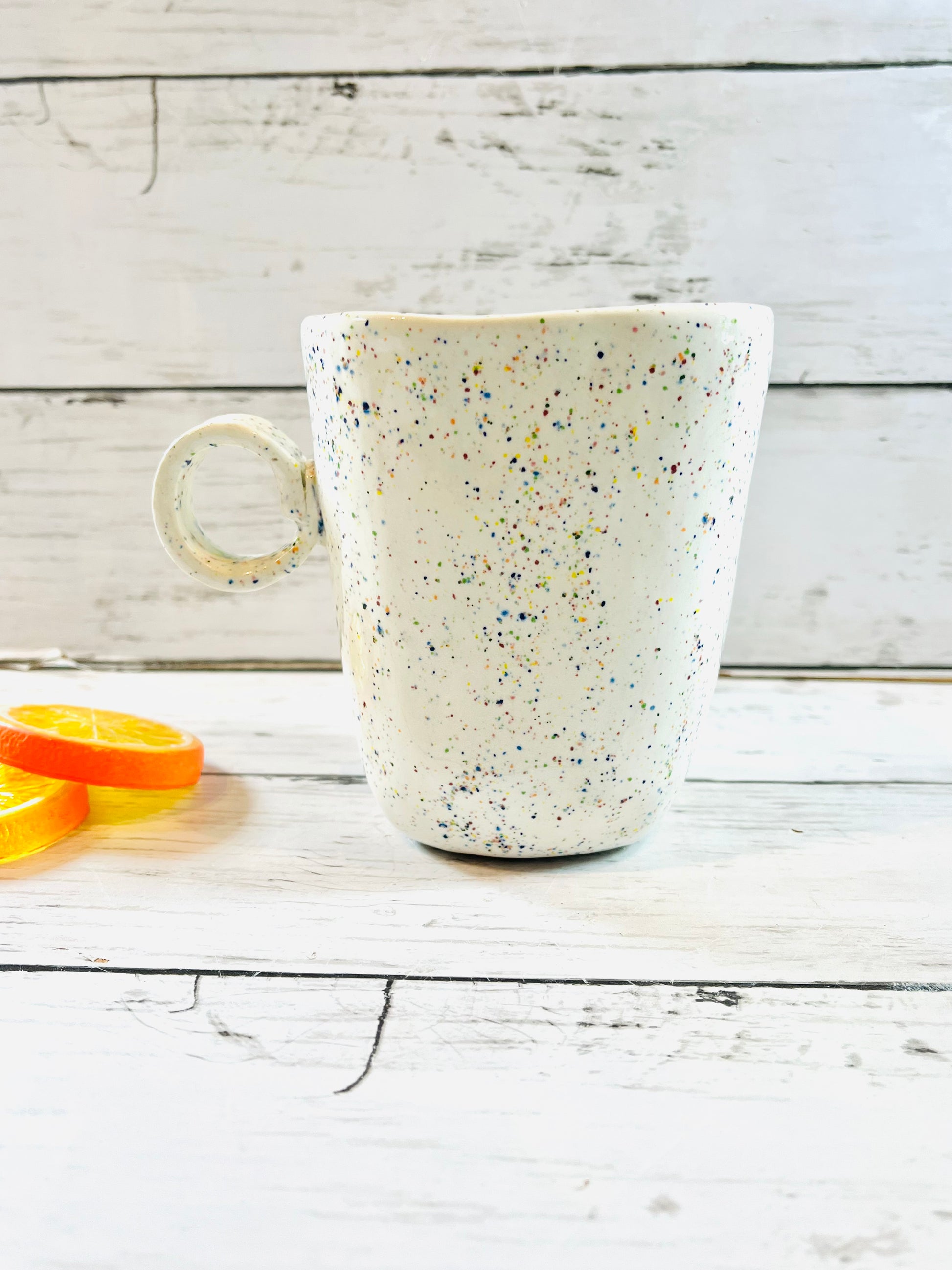 This colorful mug is hand-made with clay and hand painted with non-toxic glaze.